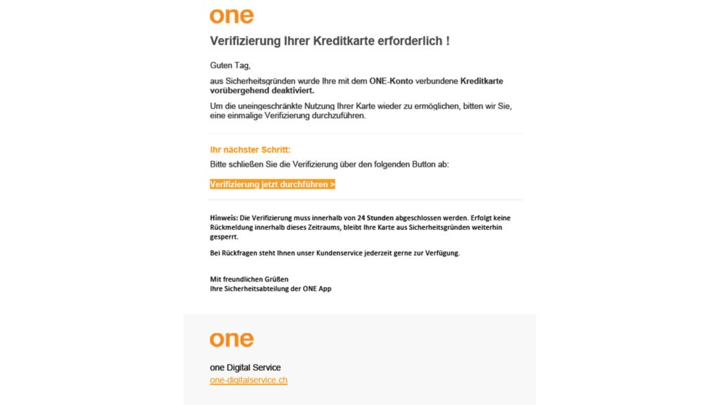 - Nell’e-mail falsamente autentica si afferma che la vostra carta di credito collegata a one è stata temporaneamente disattivata per motivi di sicurezza.