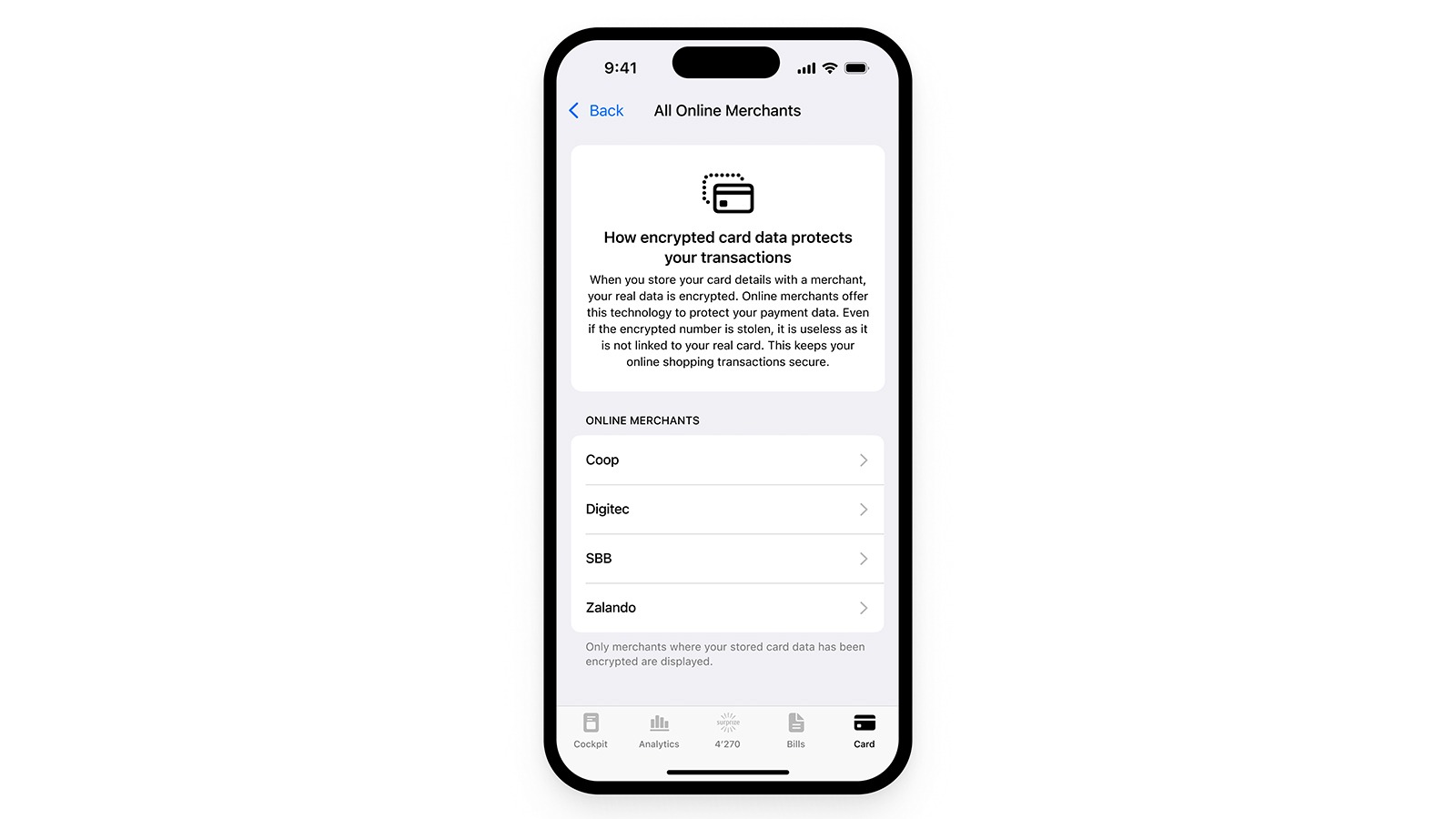 Ende Juli hat die one App ein neues Feature erhalten, «Wallets & Online Händler» gibt Ihnen eine schnelle Übersicht darüber, bei welchen Online-Händlern und digitalen Abos Ihre Karte hinterlegt ist. Online-Händler oder -Dienstleister, die Ihre Kartendaten verschlüsseln (tokenisieren), erscheinen automatisch in der Übersicht und dort können Sie sie ganz einfach deaktivieren, reaktiveren oder entfernen. So können Sie zentral über die Verwendung Ihrer Karte bestimmen. Übrigens: Die neue Funktion erlaubt Ihnen auch, ganz einfach über die Verwendung Ihrer Geräte und Wallets zu entscheiden.